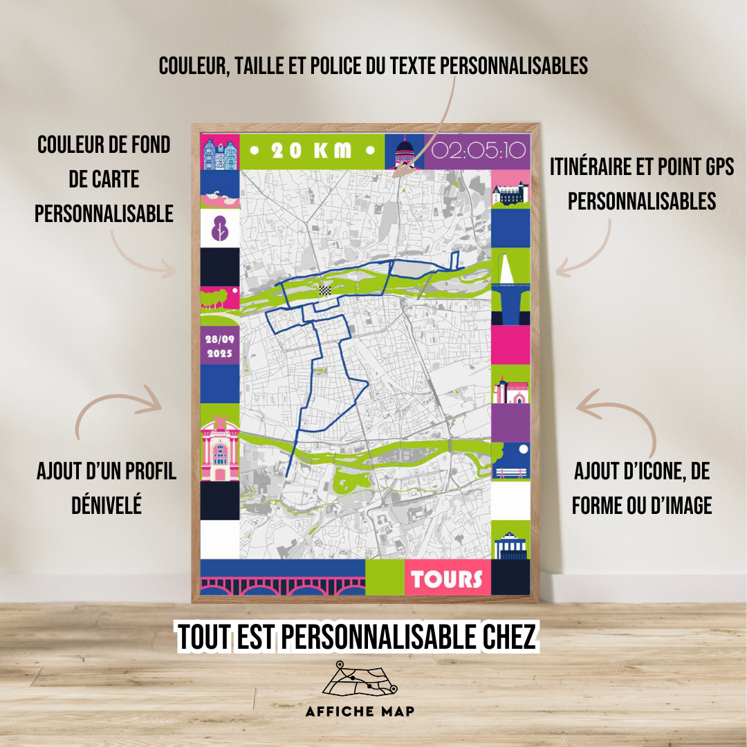 Grâce à notre studio en ligne, personnalisez votre affiche à votre guise. Intégrez votre nom, prénom, numéro de dossard, votre chrono ou même avec vos photos pour créer une œuvre qui capture votre performance des 20km de Tours 2025 de manière unique. Libérez votre créativité et créez un souvenir inoubliable de votre exploit sportif.