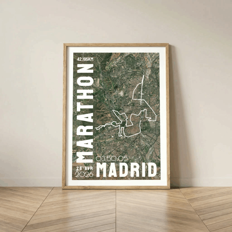 Découvrez notre affiche map exclusive des 42.95km de Madrid avec son marathon. Choisissez soit le format PDF ou la version imprimée puis lancez-vous dès à présent dans la personnalisation de votre affiche dans notre studio en ligne avec votre nom, prénom, numéro de dossard, votre chrono ou même avec vos photos.