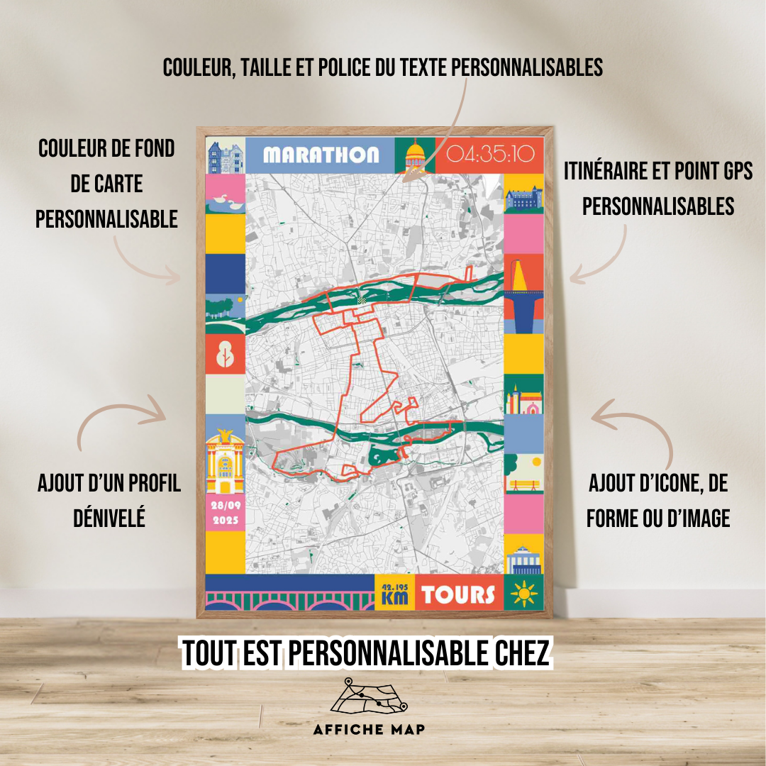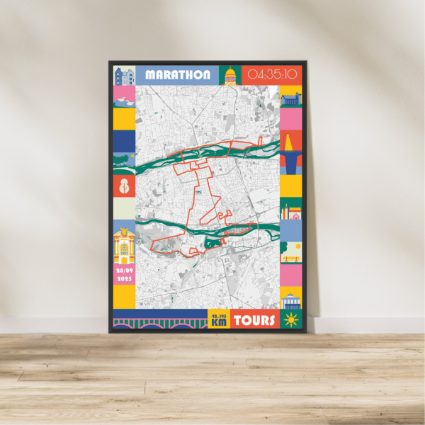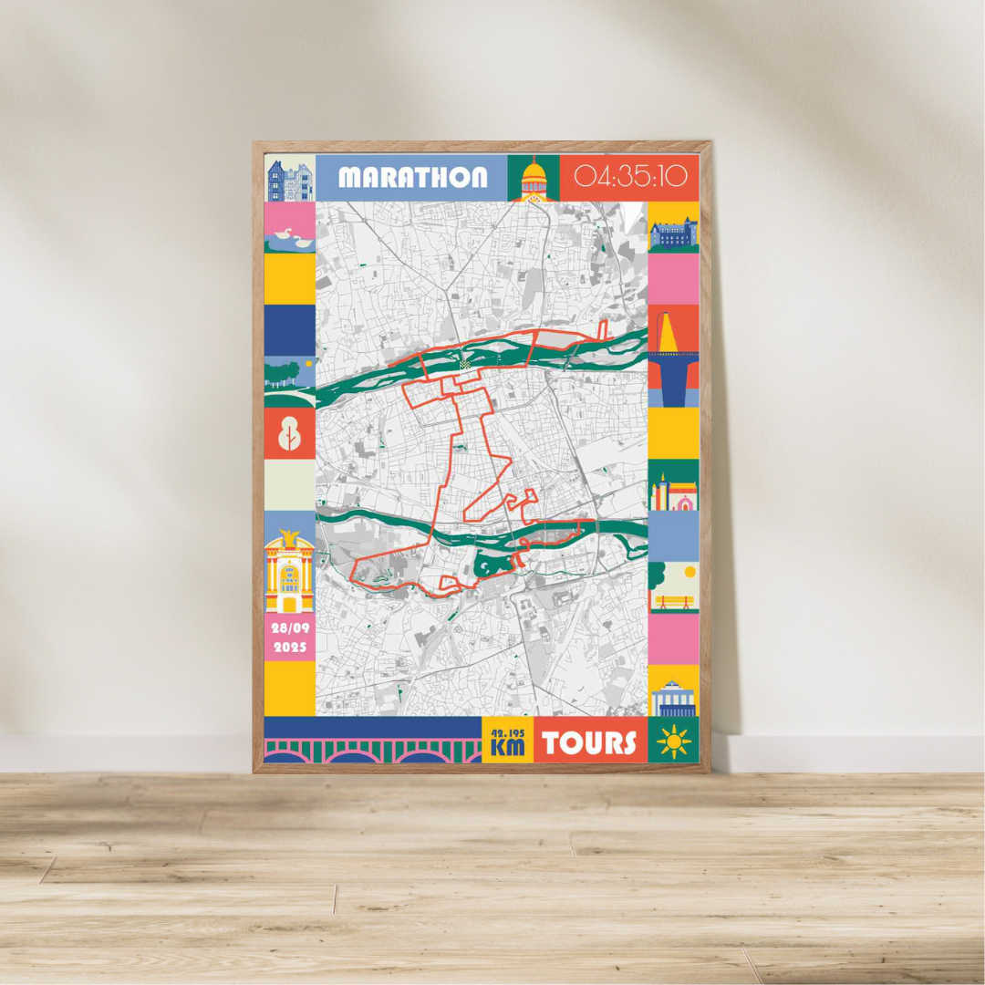 Découvrez notre affiche exclusive du marathon de Tours 2025. Choisissez soit le format PDF ou la version imprimée puis lancez-vous dès à présent dans la personnalisation de votre affiche dans notre studio en ligne avec votre nom, prénom, numéro de dossard, votre chrono ou même avec vos photos.