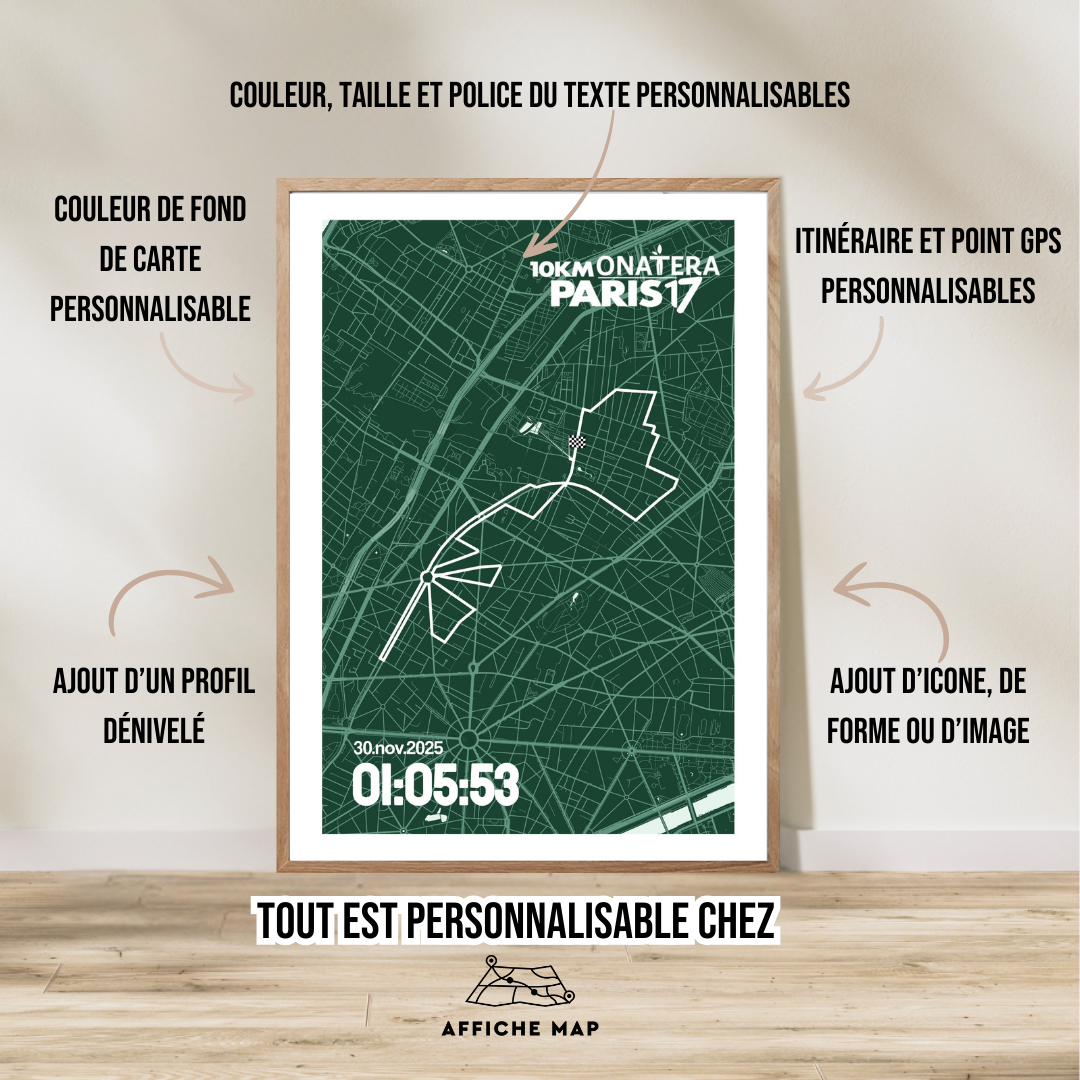 Découvrez notre affiche exclusive en partenariat des 10kms Onatera Paris17 à travers ls lieux emblématiques du 17ème arrondissement. Choisissez soit le format PDF ou la version imprimée puis lancez-vous dès à présent dans la personnalisation de votre affiche dans notre studio en ligne avec votre nom, prénom, numéro de dossard, votre chrono ou même avec vos photos.