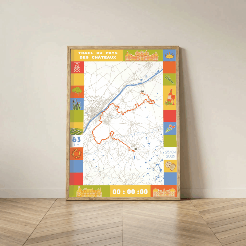 Grâce à notre studio en ligne, personnalisez votre affiche à votre guise. Intégrez votre nom, prénom, numéro de dossard, votre chrono ou même avec vos photos pour créer une œuvre qui capture votre performance du trail de 63km de Cheverny de manière unique. Libérez votre créativité et créez un souvenir inoubliable de votre exploit sportif.